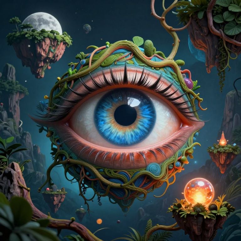 The image presents a surreal and fantastical scene dominated by a large, intricate eye in the center, with a vibrant blue iris and detailed eyelashes. Surrounding the eye are various fantastical elements, including floating islands, a moon, and a glowing orb. The background features a mix of dark, rocky terrain and lush greenery, creating a stark contrast. The overall composition is dynamic, with elements such as vines and branches intertwining and framing the scene. The colors are rich and varied, with shades of blue, green, and orange dominating the palette. The image is rich in detail, with intricate textures and patterns adorning the various elements, from the eye's eyelashes to the rocky formations in the background. The scene is both otherworldly and captivating, inviting the viewer to explore its many layers and details.