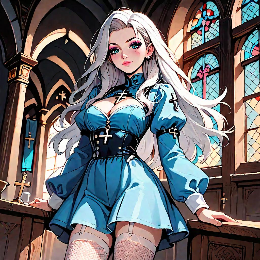 Score_9, score_8_up, score_7_up, source_anime, solo, 1girl, smile, looking at viewer, standing, long hair, white hair, blue eyes, ragnarokarch, two-tone dress, blue dress, cross, cleavage cutout, puffy sleeves, long sleeves, white thighhighs, fishnet thighhighs, indoors, church