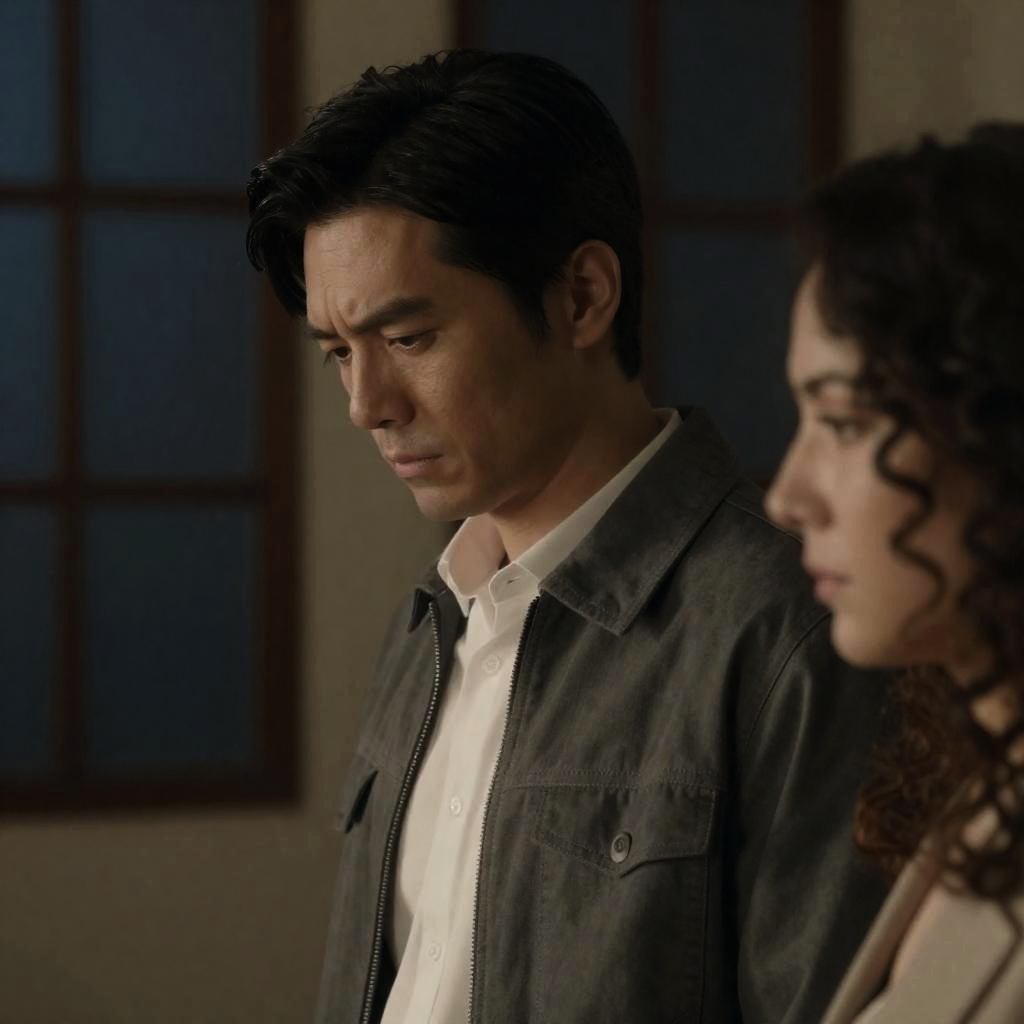 Photograph of a man and a nun standing side by side. The nun wears a black and white habit, looking serious. The man has dark hair, a mustache, and wears a black suit with a white shirt, looking contemplative. Background is blurred with greenery. Both have neutral expressions.