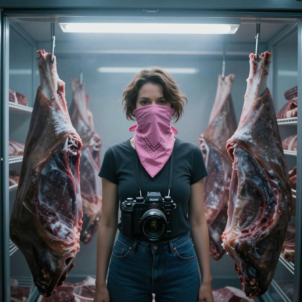 Photograph of a woman with shoulder-length brown hair, wearing a black t-shirt, blue jeans, and a pink bandana covering her mouth, standing in a cold, metallic room. She has a camera with a large lens hanging around her neck. Two large, hanging, raw, bloody carcasses flank her on both sides. The background shows more carcasses on metal shelves, illuminated by bright, overhead fluorescent lights, creating a stark, clinical atmosphere. The image has a gritty, realistic style with high contrast and sharp details.