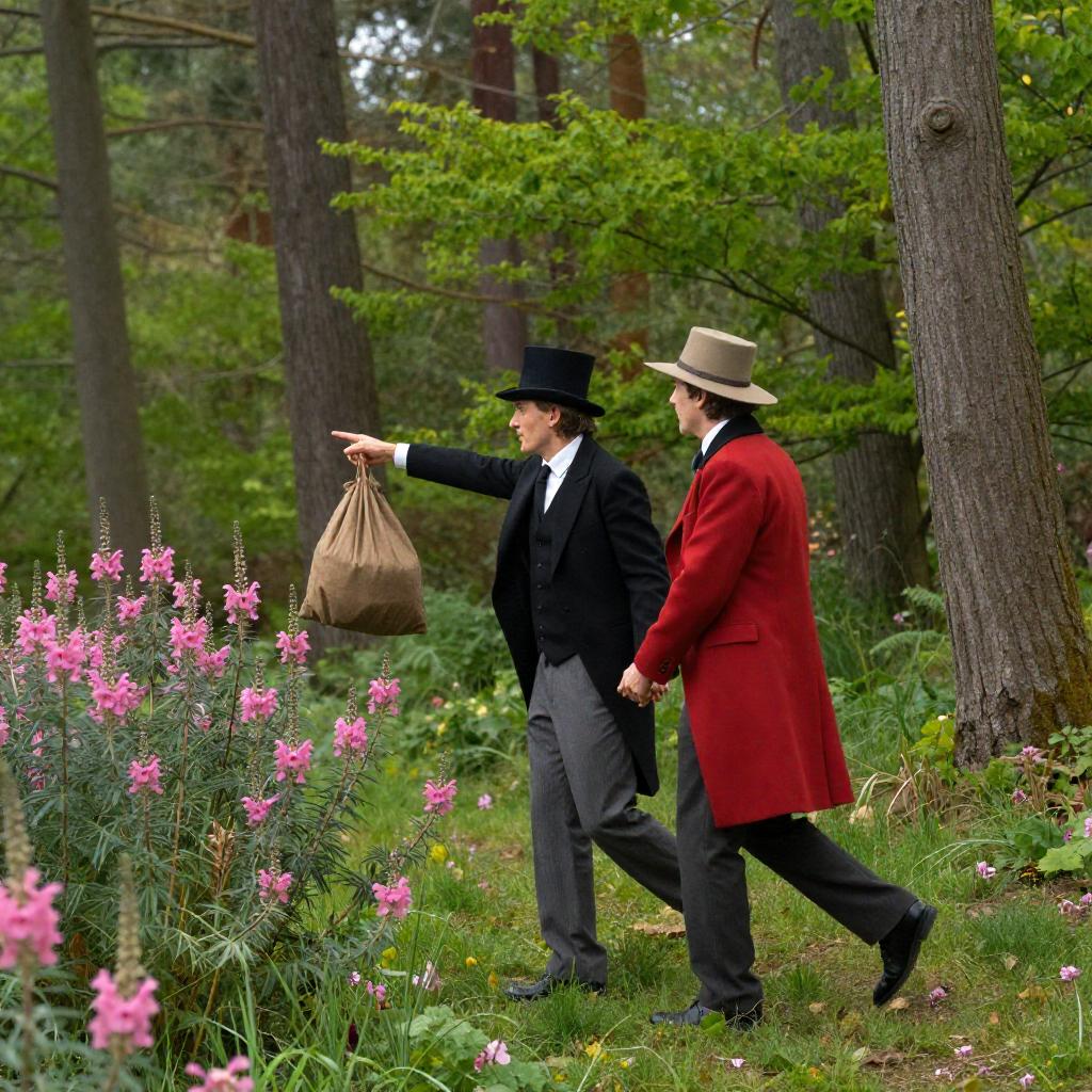 Two men in a lush forest. One in a black suit and top hat, pointing at pink flowers, holding a brown sack. The other in a red coat and wide-brimmed hat, holding hands with the first man. Bright colors, vivid greenery, large trees, and scattered flowers. Both men are in mid-stride, looking forward.