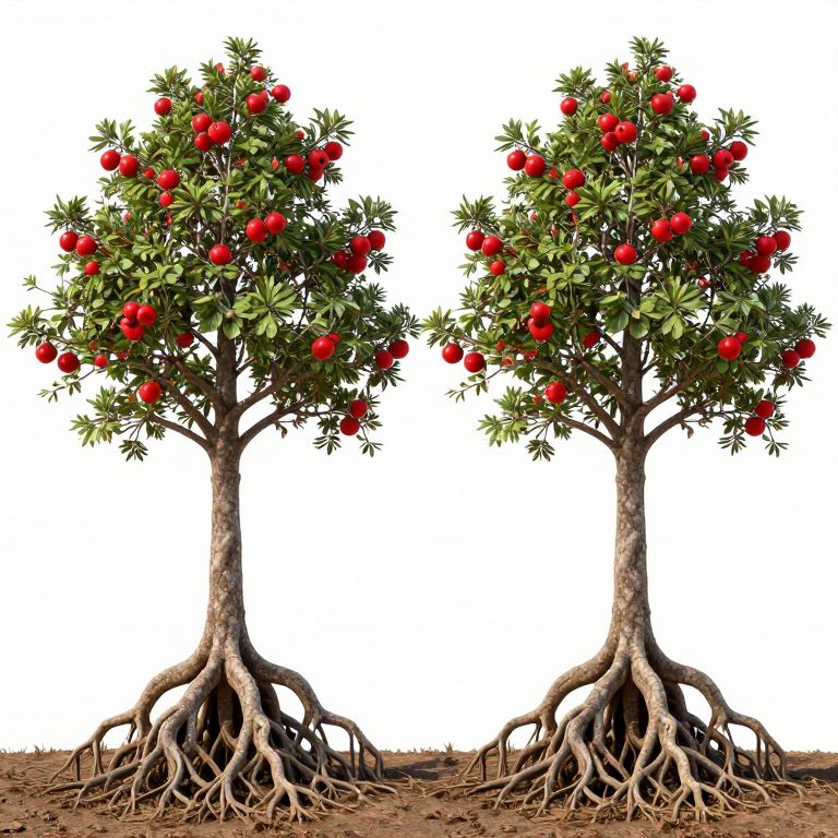 This is a digital illustration of two apple trees with visible roots. Both trees have green, leafy canopies and are adorned with numerous bright red apples. The trunks are brown and textured, extending from the ground where their extensive, intertwining roots are visible. The trees are positioned side by side against a plain white background, emphasizing their detailed foliage and fruit. The ground is brown and slightly textured, showing the soil. The illustration style is realistic with a slight emphasis on detail, making the trees and roots appear lifelike.