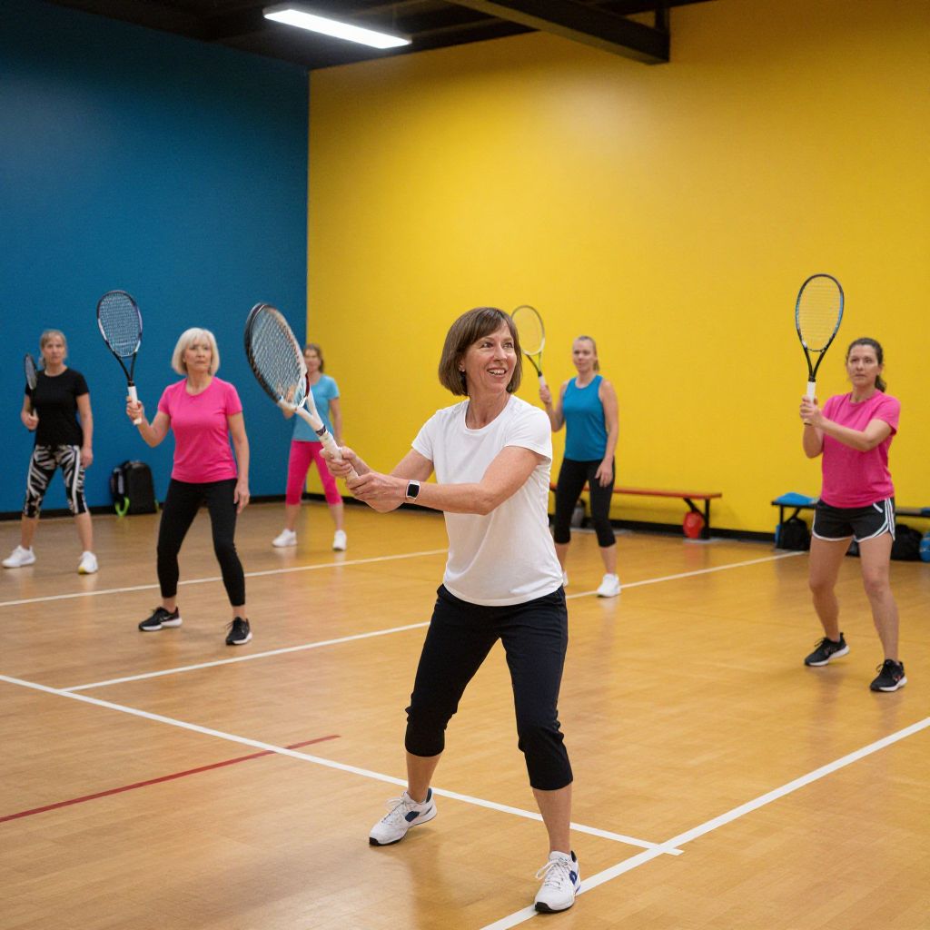 A diverse group of women aged 30 to 50 engaged in a racquet sport at a community sports center, one woman with short brown hair and a bright smile striking a return shot, surrounded by brightly painted walls and modern equipment, warm indoor lighting.