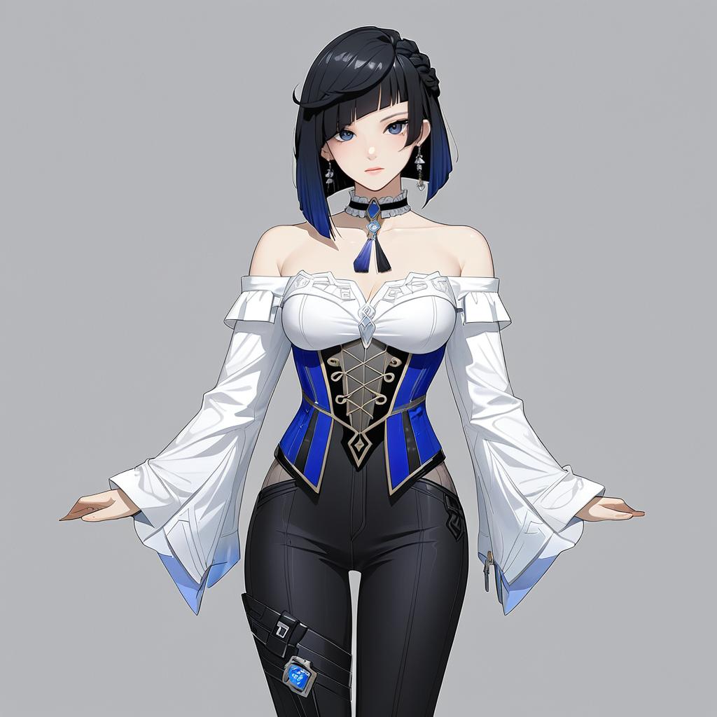 Digital illustration of an anime-style young woman with short black and blue hair wearing an off-the-shoulder white blouse, a blue and black corset with golden accents, and black pants. She has striking blue eyes, a choker necklace with a blue gem, and matching earrings. The background is plain and light grey.
