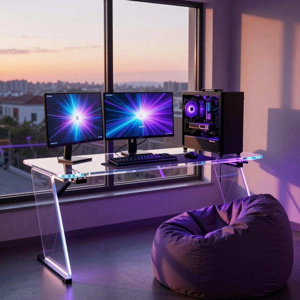 Gaming setup in front of window during sunset, featuring futuristic transparent desk, holographic displays, glowing peripherals in purple hues, comfortable beanbag chair, warm natural light casting shadows
