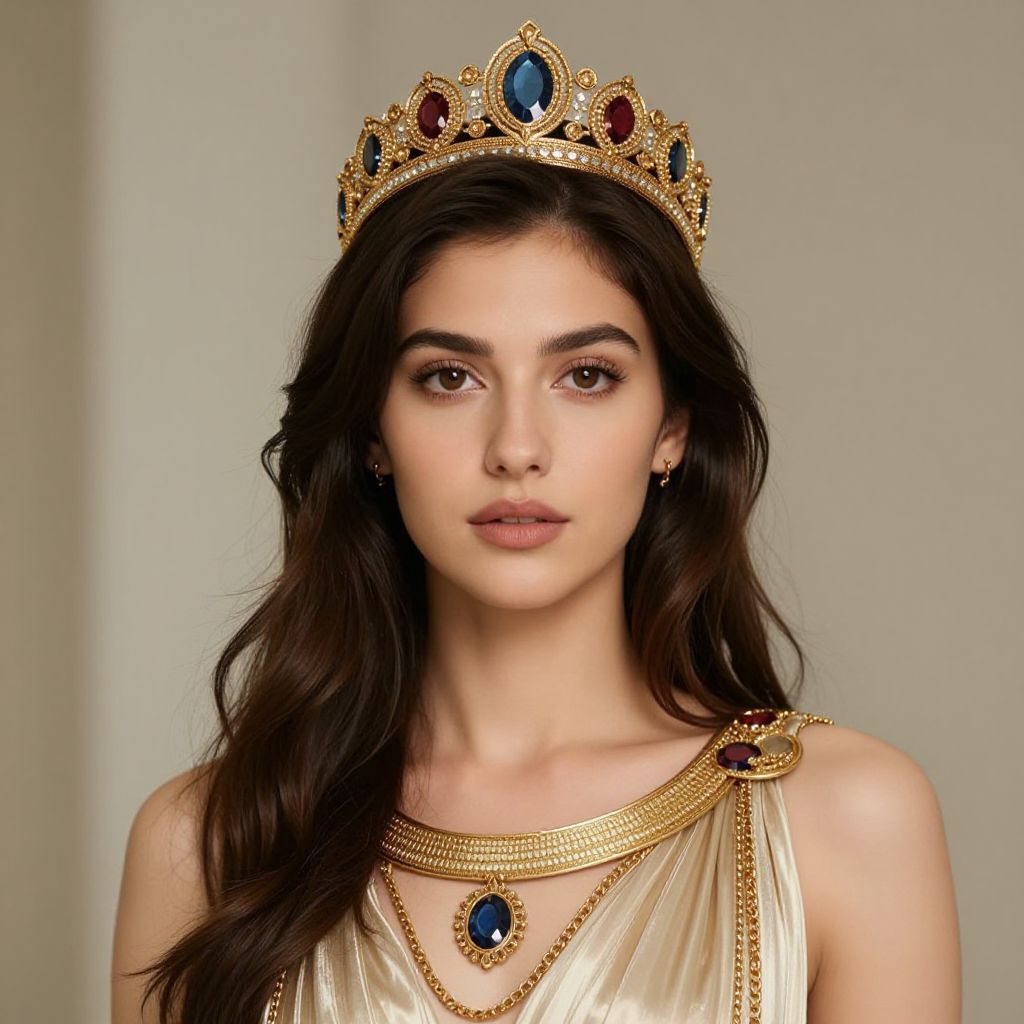 "Secy Greek Goddess, a close up of a woman wearing a crown and a dress"