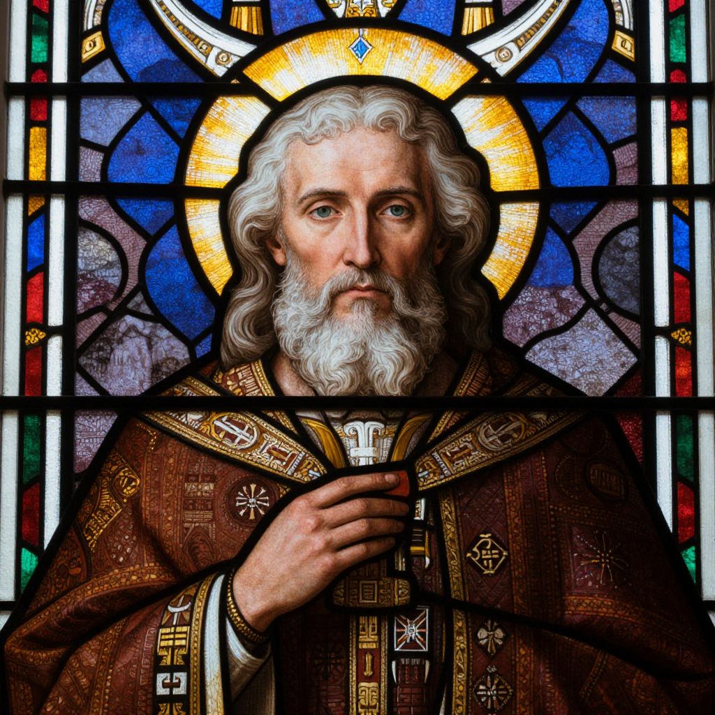 The image depicts a highly detailed and textured portrait of a bearded man, likely a religious figure, set against a stained glass window. The man's face is illuminated by the soft, warm light filtering through the glass, creating a halo effect around his head. His curly, white hair and beard add to the sense of age and wisdom. He is dressed in a robe with intricate patterns and symbols, suggesting a high rank or a specific religious order. The background features a complex, ornate stained glass window with various geometric shapes and patterns, adding depth and richness to the scene. The overall composition is balanced, with the figure centrally positioned and the stained glass window framing him, creating a sense of reverence and sanctity. The interplay of light and shadow, along with the detailed textures of the robe and hair, enhances the realism and depth of the portrait.