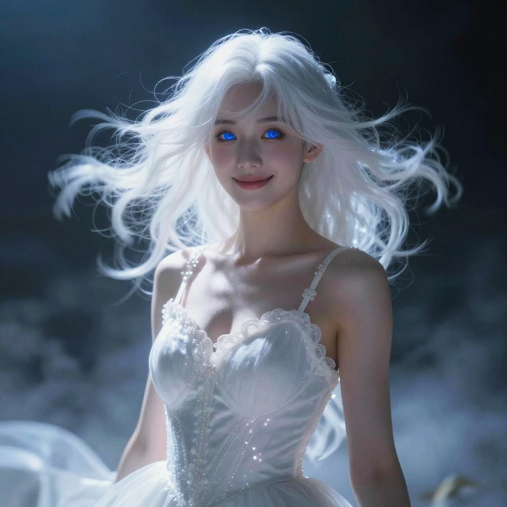 Portrait of an ethereal young woman with long flowing white hair and striking blue eyes, wearing a detailed white dress. The image features cinematic moody lighting, depth of field, and volume fog, creating a glowing, enchanting atmosphere with soft motion blur and atmospheric background.