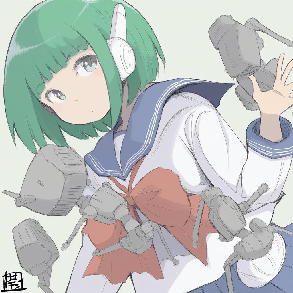 Digital anime-style illustration of a young girl with short green hair and green eyes wearing a traditional Japanese sailor school uniform (serafuku) with long sleeves. She has robot-like ear devices and several mechanical, gun-like appendages surrounding her, emphasizing a fusion of human and android features. The artwork is inspired by the style of artist Hadashi no Kenji and related to the To Heart series.