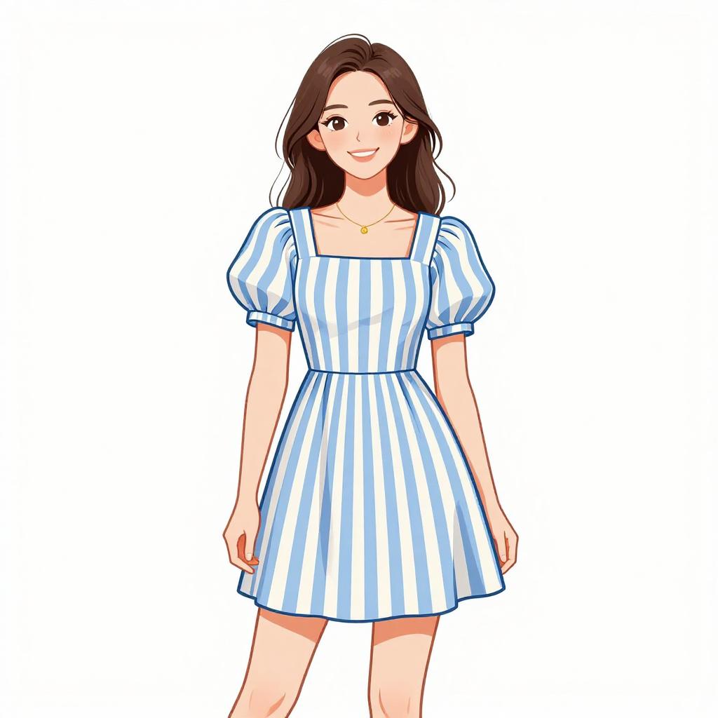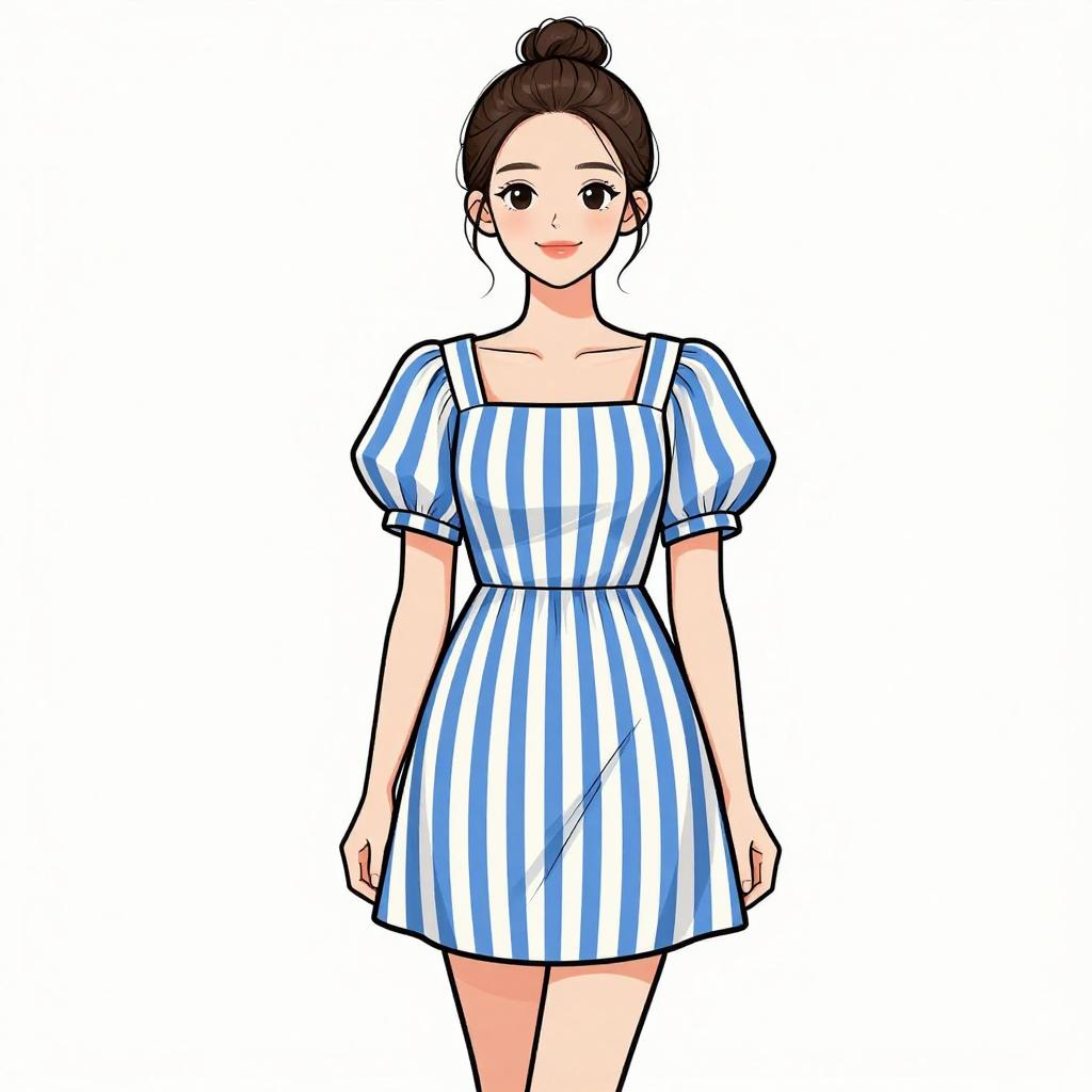 Woman with pretty face and pretty hair. smiling Woman, casual, square-neck mini dress in a blue and white vertical stripe pattern, short puff sleeves, gathered waist, straight hem, light makeup, hair pulled back in a messy bun, white minimalist studio background. --sref 1467