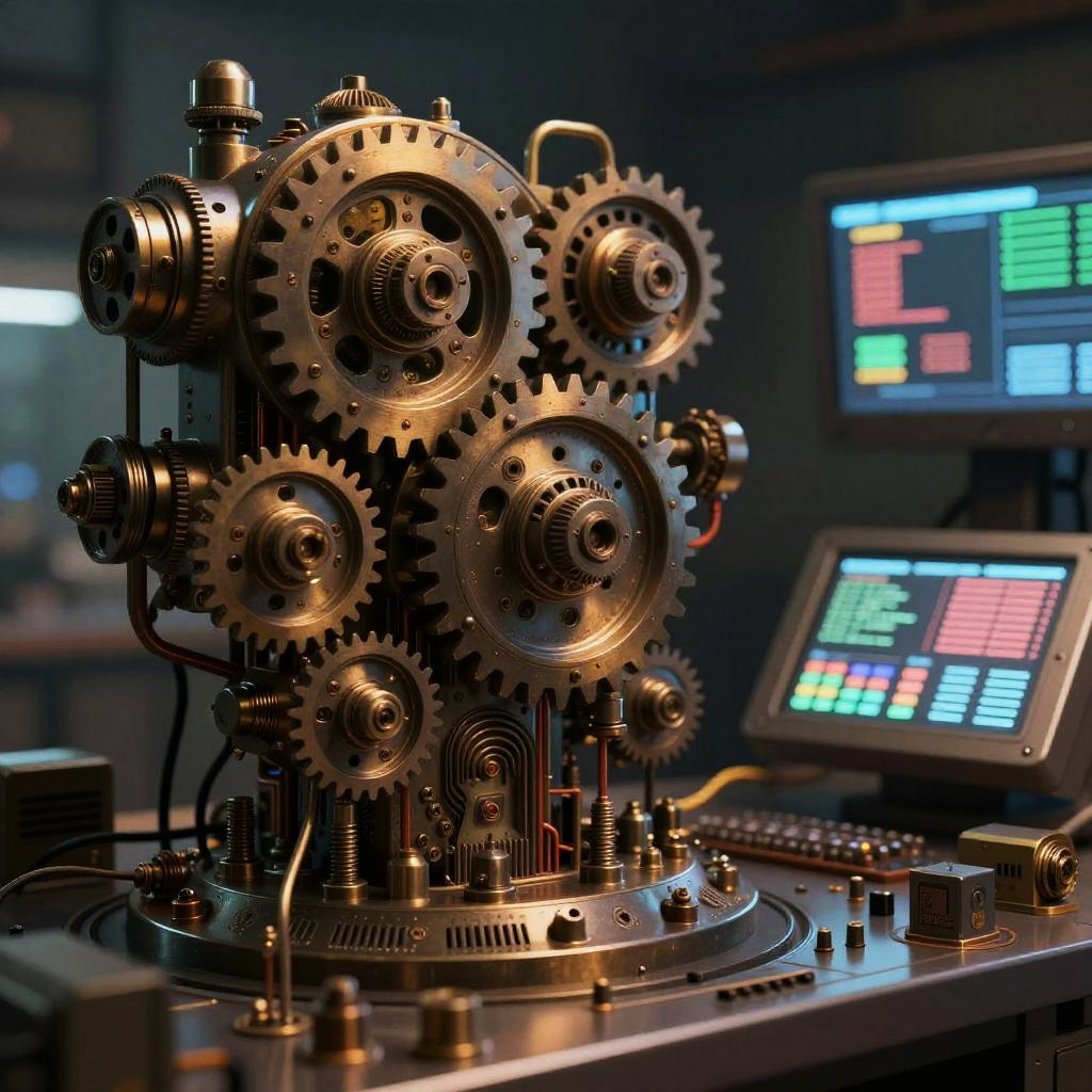 Stable diffusion settings represented as an elaborate machine with gears and circuits blending into a digital control board, steampunk meets futuristic technology style, rich textures in metallic and glowing elements, ambient moody lighting, captivating detail.
