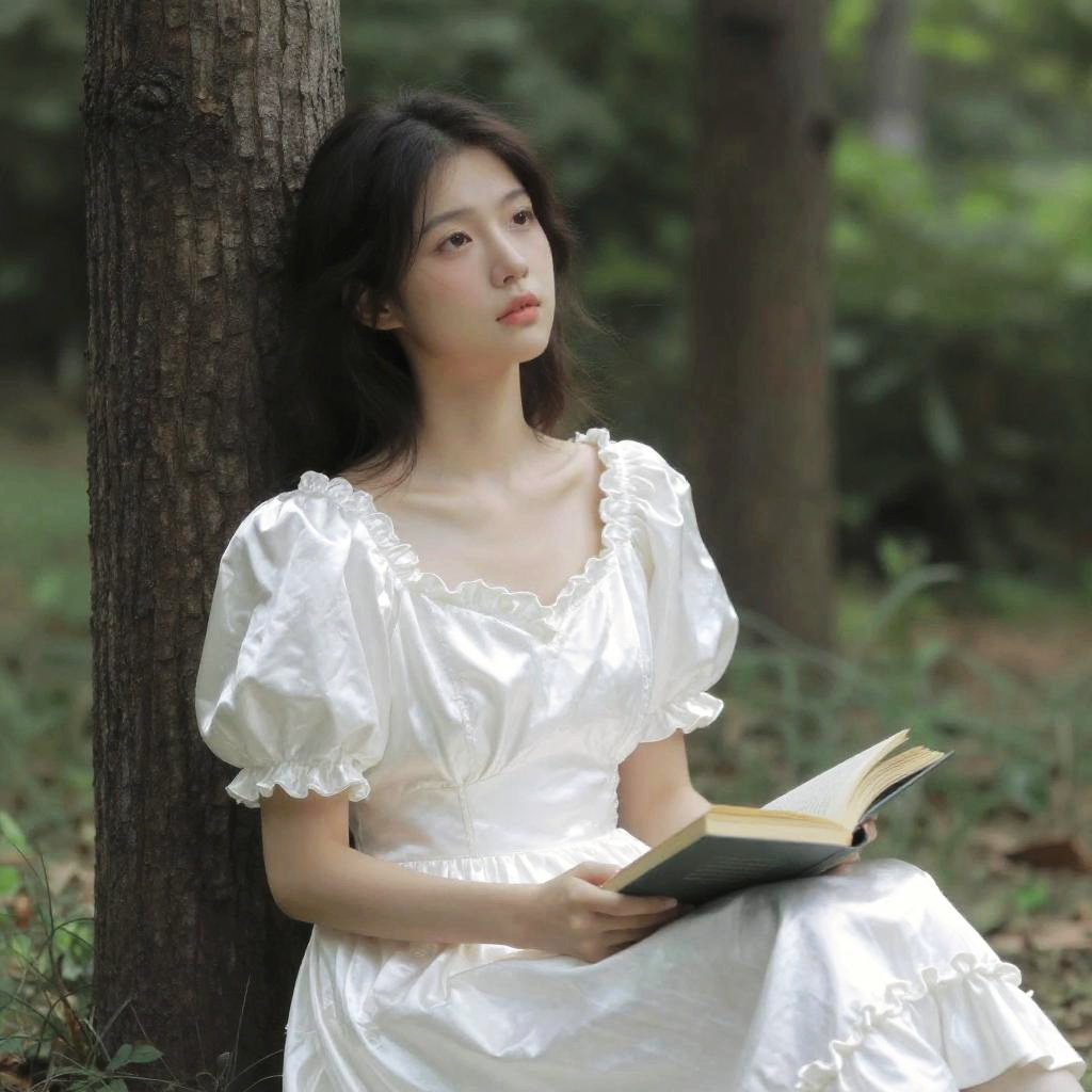 This is a digital painting of a young woman with fair skin and dark hair, wearing a white satin dress with puffed sleeves, sitting against a tree in a forest. She's holding an open book in her lap and looks thoughtfully to the side. The background is lush with greenery and dappled light. The painting has a realistic, almost classical style with a soft, dreamy quality.