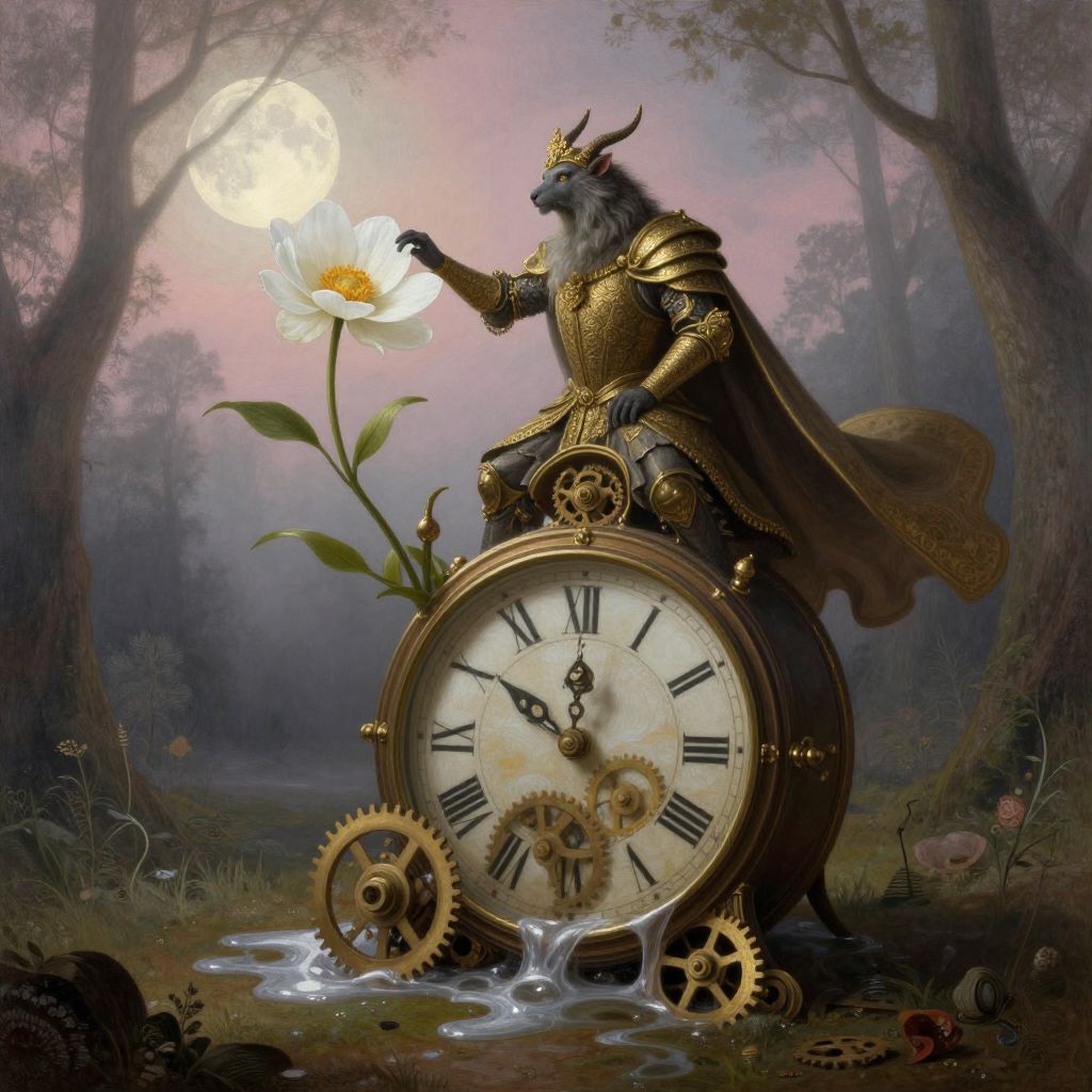 Craft an enchanting image in the dreamlike surrealist style, depicting a surreal landscape where a majestic golden mythical creature gracefully traverses a winding path of melting timepieces. The creature stands tall amidst an otherworldly sky filled with floating clock hands and abstract time-related elements, reflecting the complex emotional gradient of timelessness and wonder. The scene is captured from a unique aerial perspective above the scene, emphasizing the whimsical and fantastical nature of this enchanting dreamscape.
