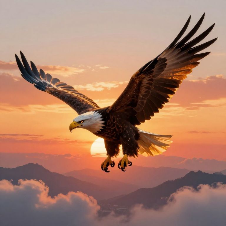George Washington riding an eagle over the American Revolution battlefield, historical elements, sunrise light, dramatic clouds, detailed eagle feathers, symbolic and powerful imagery