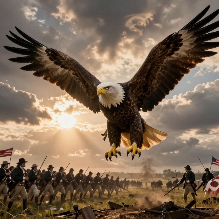 Photograph of a majestic bald eagle soaring above a battlefield, with soldiers in Civil War-era uniforms, flags, and scattered debris below. Dramatic sunset
