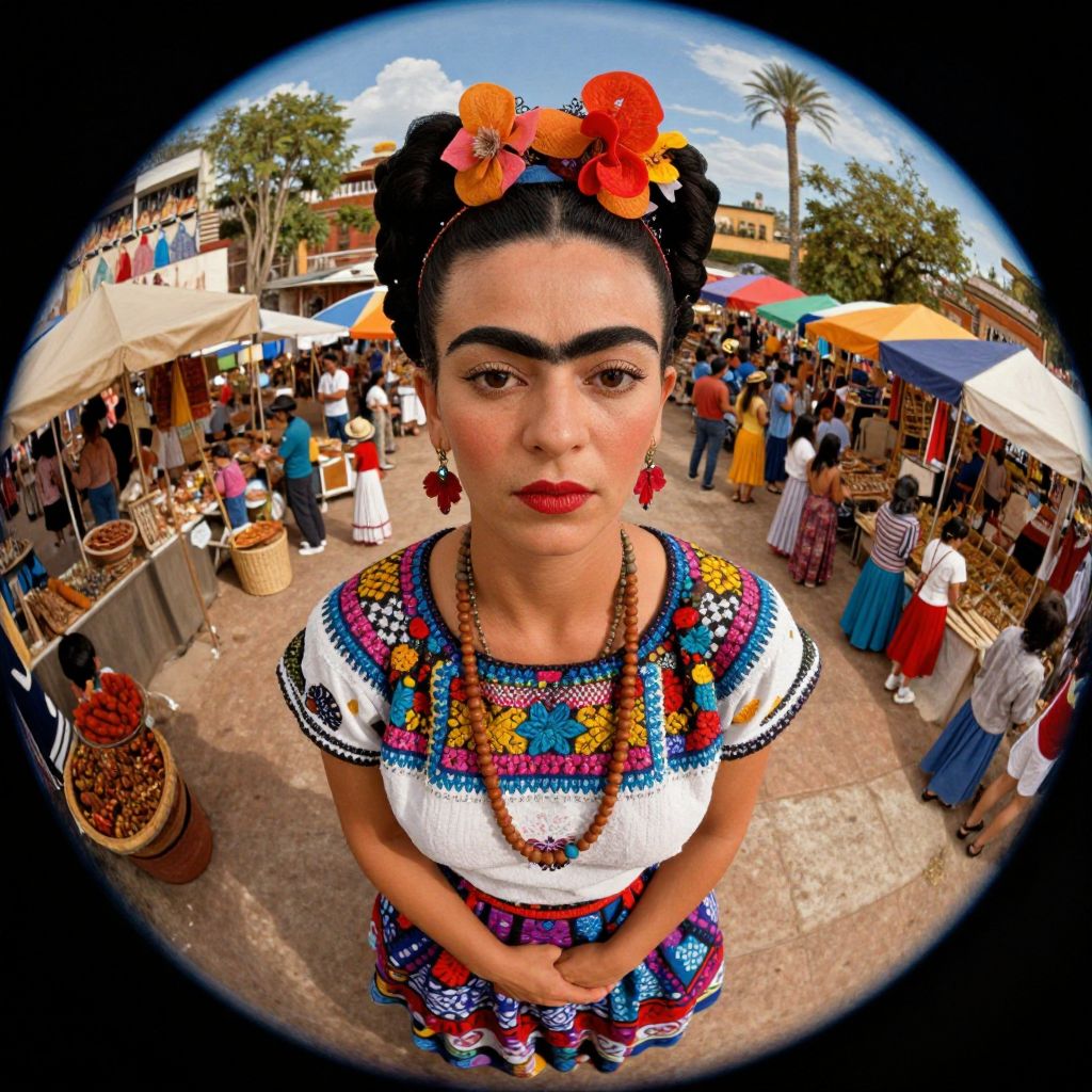 Create an enchanting portrait in the dynamic style reminiscent of Frida Kahlo's vibrant expressions, but crafted with digital art techniques. Depict a woman in a flowing, intricately patterned indigenous Mexican dress from an unconventional viewpoint, as if viewed through a fish-eye lens situated above her. This perspective should reveal a lively and bustling market scene in the background, blending elements of fantasy with traditional culture to evoke a sense of wonder and enchantment. The emotional gradient should transition seamlessly from the introspective gaze of the subject to the vibrant, diverse atmosphere surrounding her.