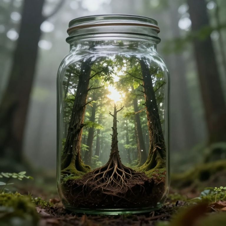 A glass jar suspended in a misty forest contains a miniature, inverted world where trees grow downward into the earth, their roots reaching toward a luminous sky within the confines of the jar, defying gravity and reality alike.
