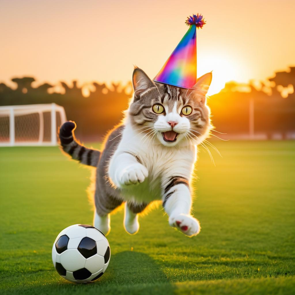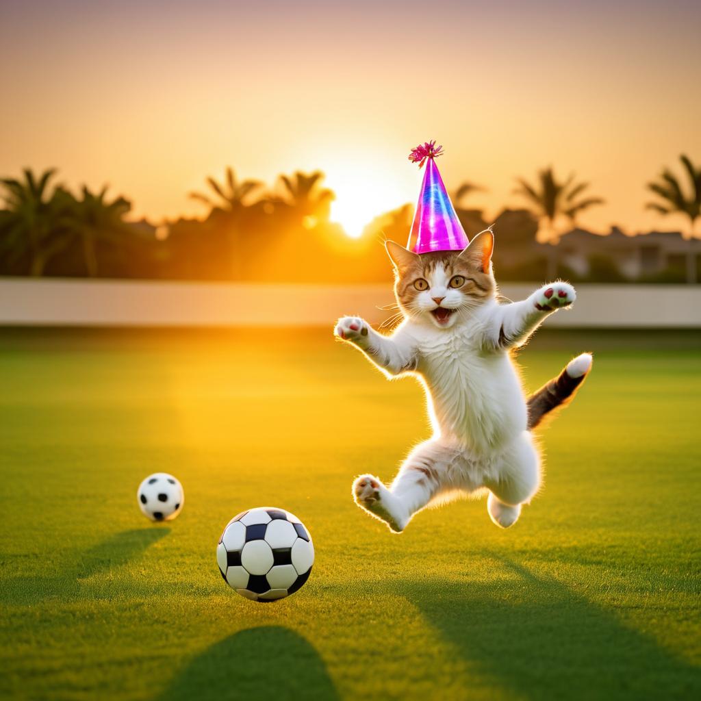 A cat wearing a party hat playing soccer at sunset. The scene captures a playful atmosphere with dynamic action.