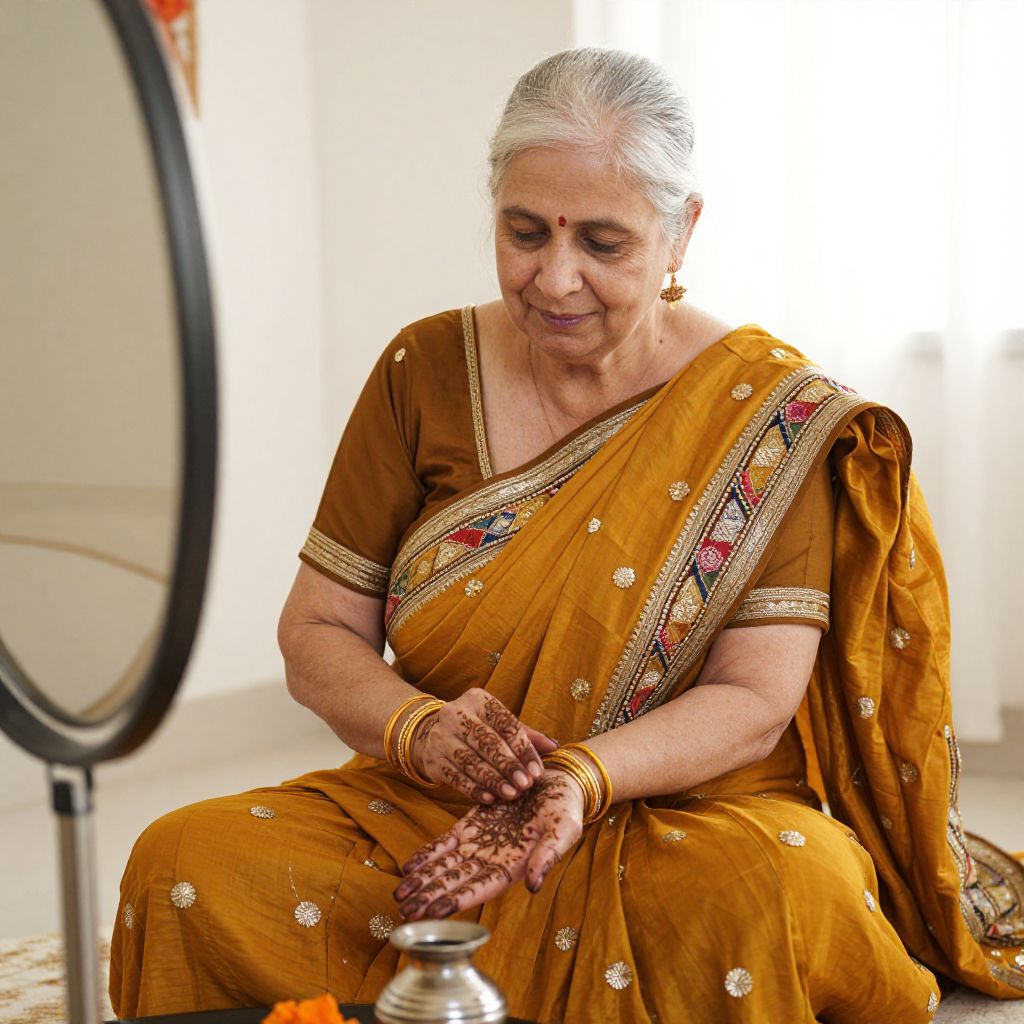 A well-lit, naturalistic photo of an elder woman with a kind face, silver hair tied neatly, wearing a richly embroidered karwa chauth saree in deep saffron with gold zari and a decorative border, seated in front of a mirror, applying henna on her hands as part of the ritual, with a small karwa pot in her lap, capturing the traditional and cultural beauty of the festival.. The woman has big tits and cute face