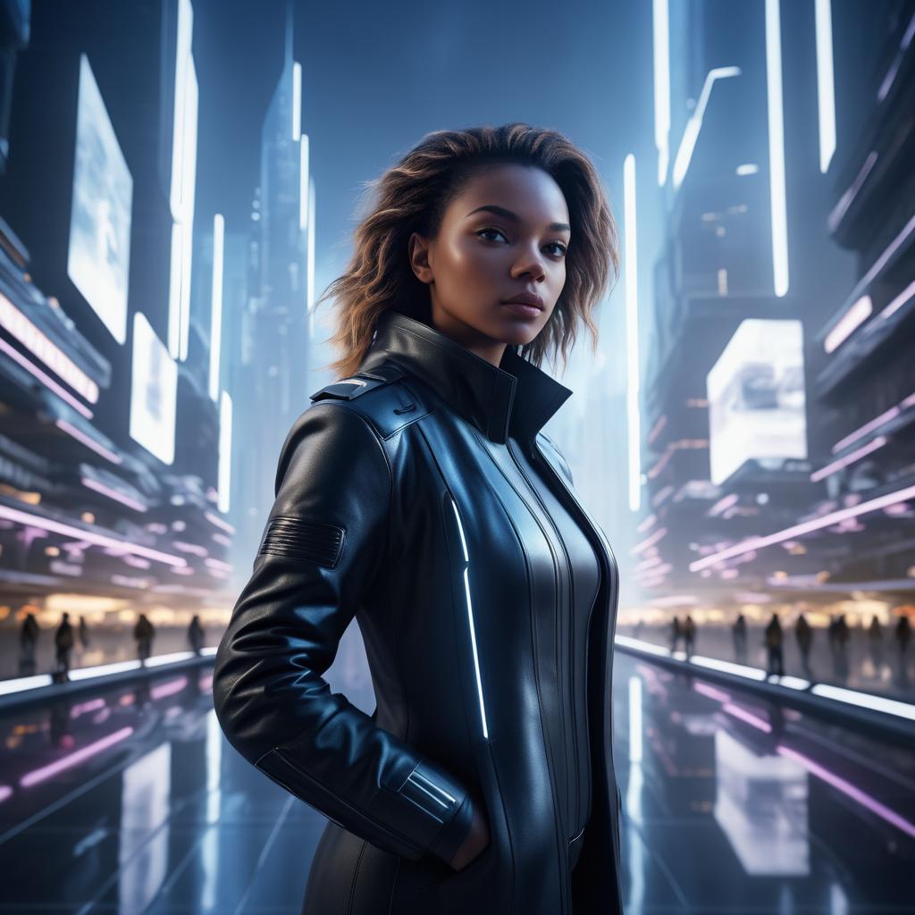 Woman in a futuristic cityscape, photorealistic, with epic lighting, insanely detailed and cinematic atmosphere.