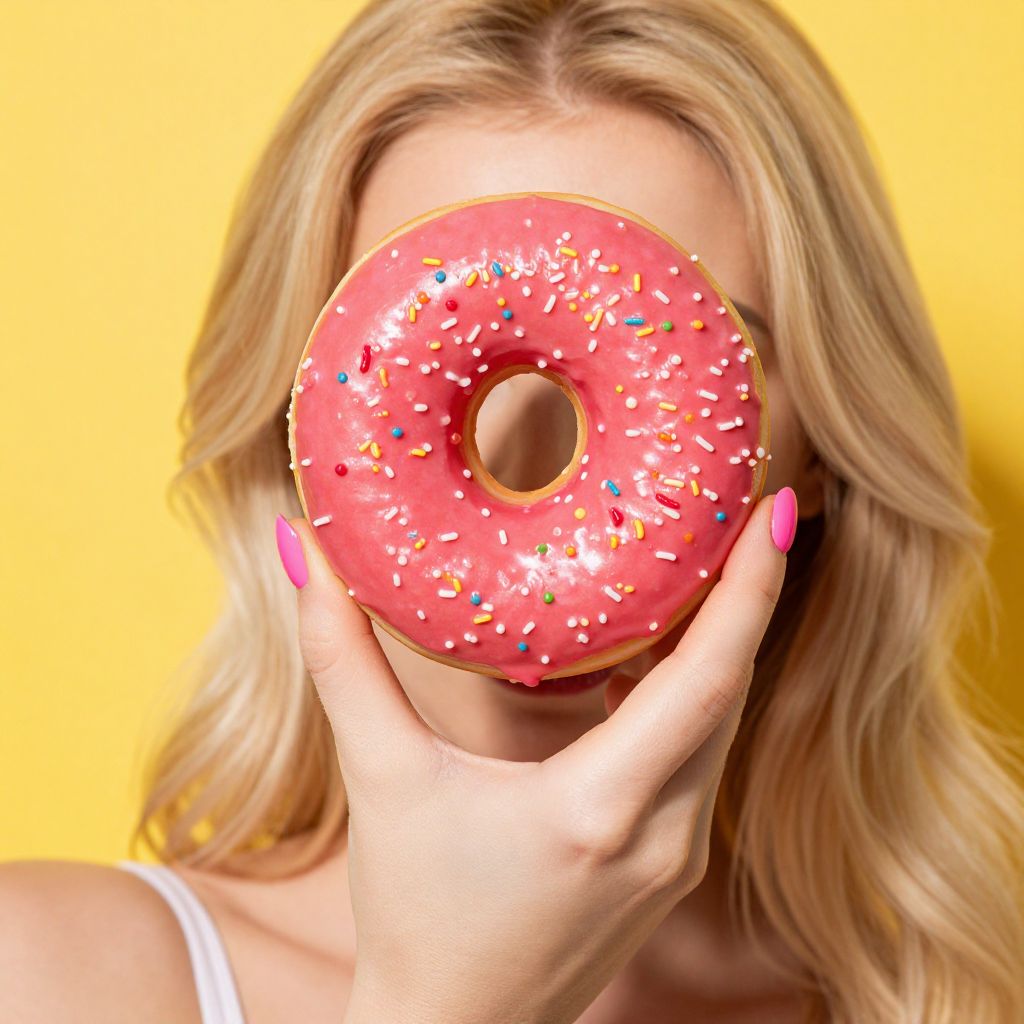 Blonde woman holding a vibrant pink-glazed donut with colorful sprinkles, her nails painted pink, against a bright yellow background.