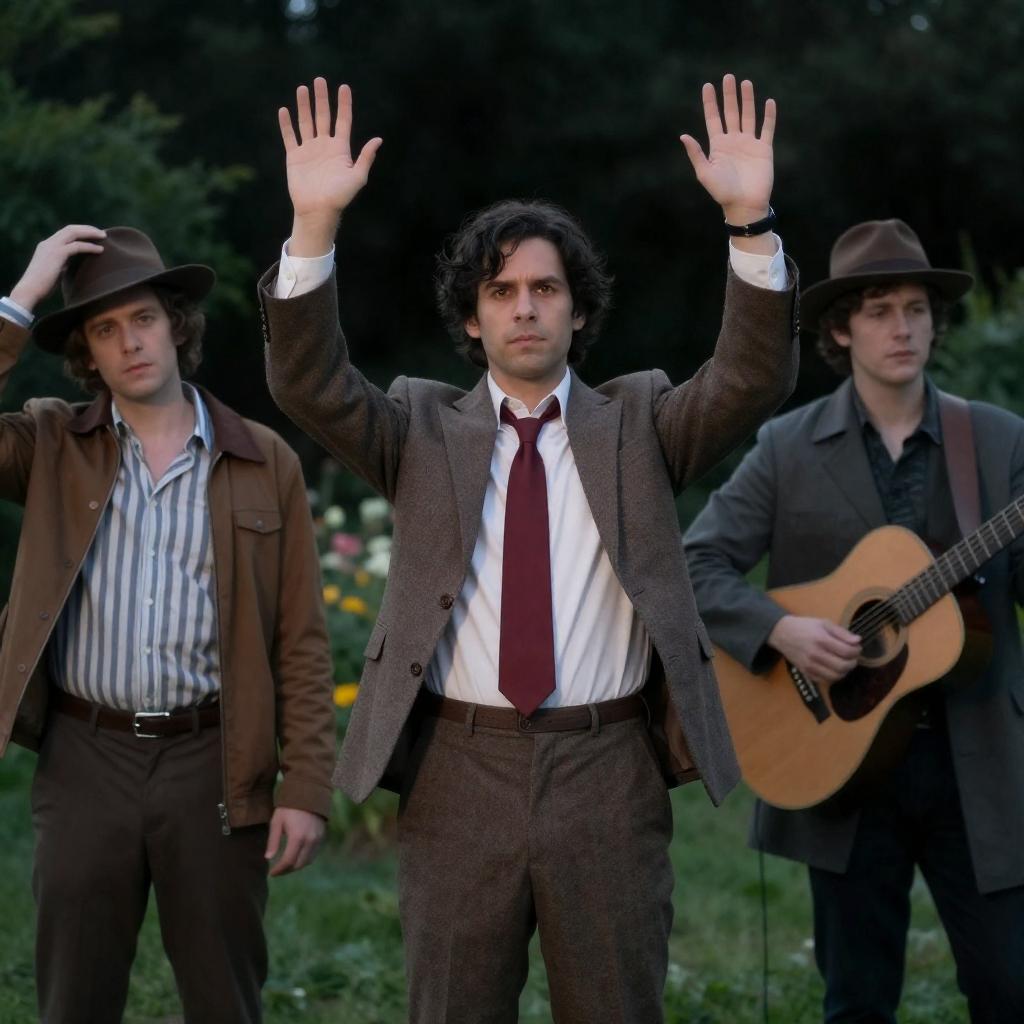 Photograph of three men with surprised expressions, arms raised, standing behind a glass window. They wear casual clothes, including a gray t-shirt, white shirt with a black vest, and a blue jacket. Blue umbrellas and parked cars are visible outside. The men have different hair styles, with one having curly hair.