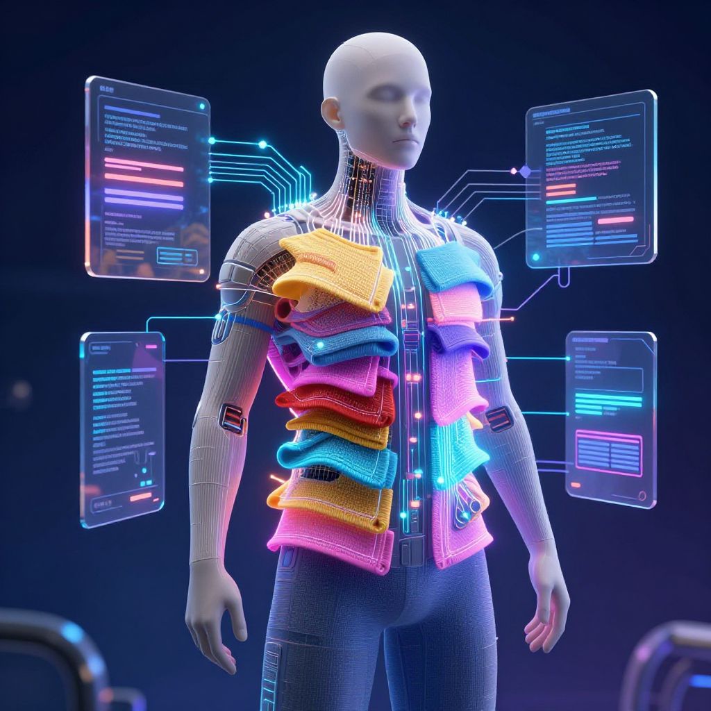 Digital CGI of a bald, humanoid figure with neon-colored, stacked circuit board segments on the chest, surrounded by floating, glowing data screens in a dark