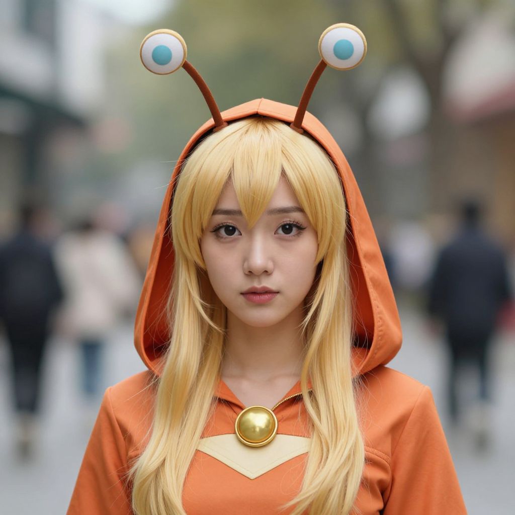 Miraculous ladybug costume, solo, blonde hair, 1girl, hood, blurry background, looking at viewer, blurry, realistic, outdoors, antennae