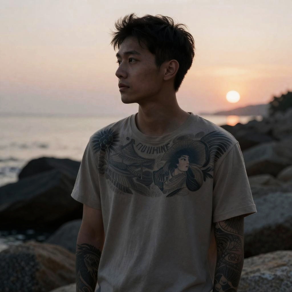 Realistic photo.tattooed young man, highly detailed and realistic, intricate tattoos, wearing casual t-shirt, rocky beach at sunset, serene and contemplative expression, moody lighting, inspired by Japanese art, subtle textures and natural colors realistic photo