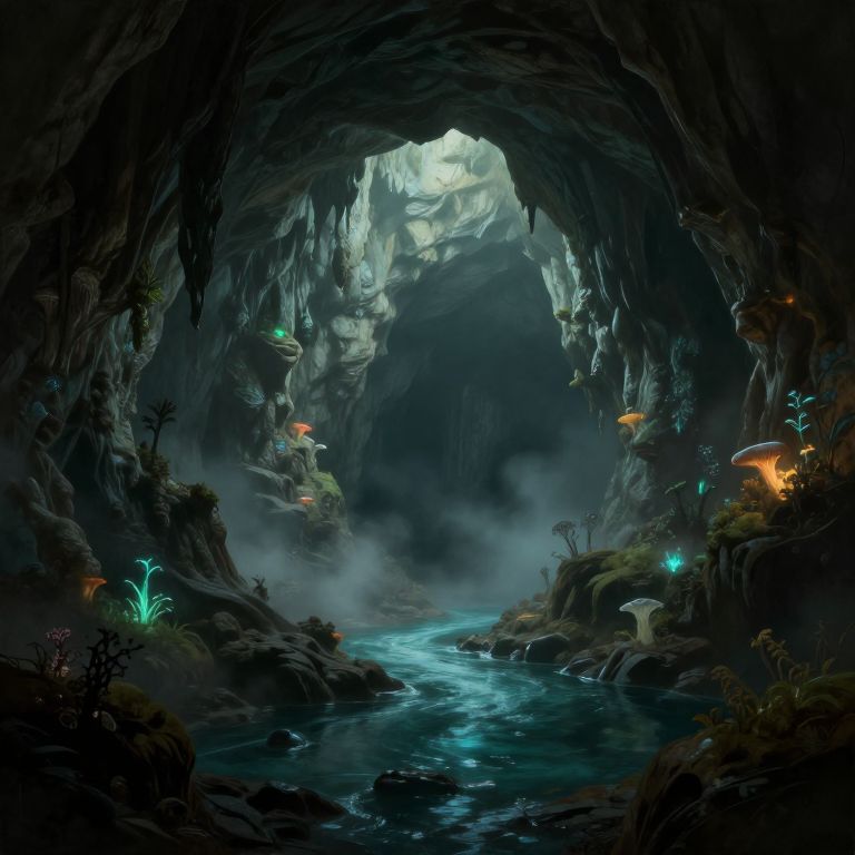 Cave concept art depicting a vast subterranean cave system with a hidden underground river, bioluminescent plants and fungi along the walls, misty ambiance, cavernous depth, cinematic lighting, painterly style, fantasy world design.