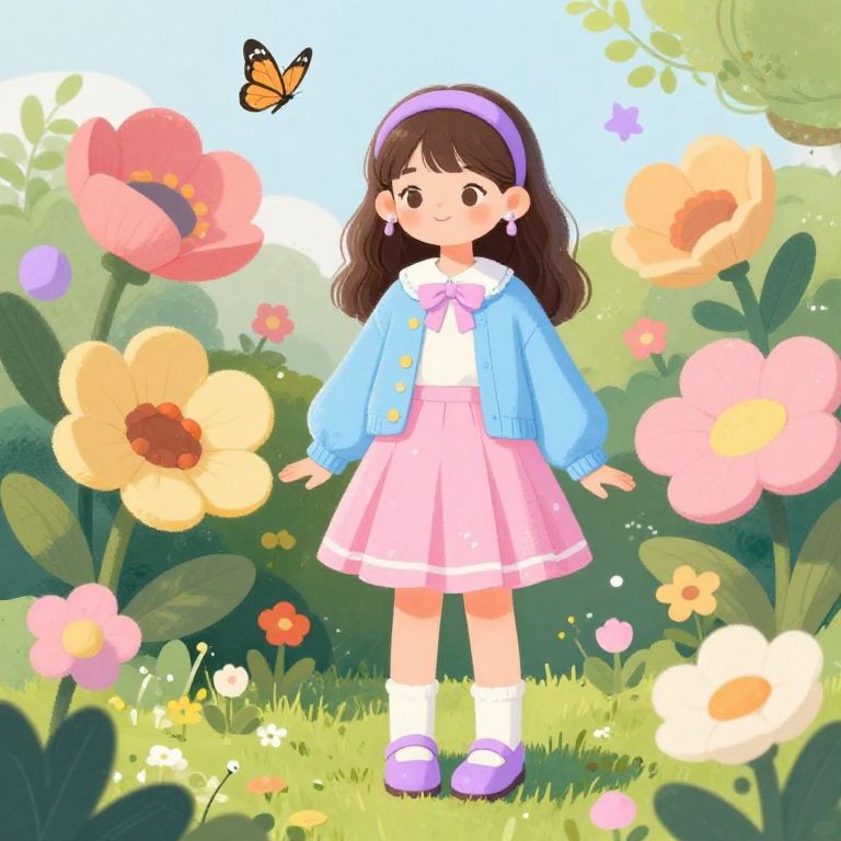 Digital illustration of a young girl standing in a vibrant, sunlit garden. She has light skin, brown wavy hair, and wears a blue cardigan over a white blouse with a pink bow, a pink skirt with white trim, white knee-high socks, and purple shoes. A purple headband holds her hair back. A colorful butterfly hovers near her head. The background is filled with large, colorful flowers in shades of pink, yellow, and orange, with green foliage and a bright blue sky. The style is whimsical and cartoon-like, with soft, rounded shapes and bright, cheerful colors.