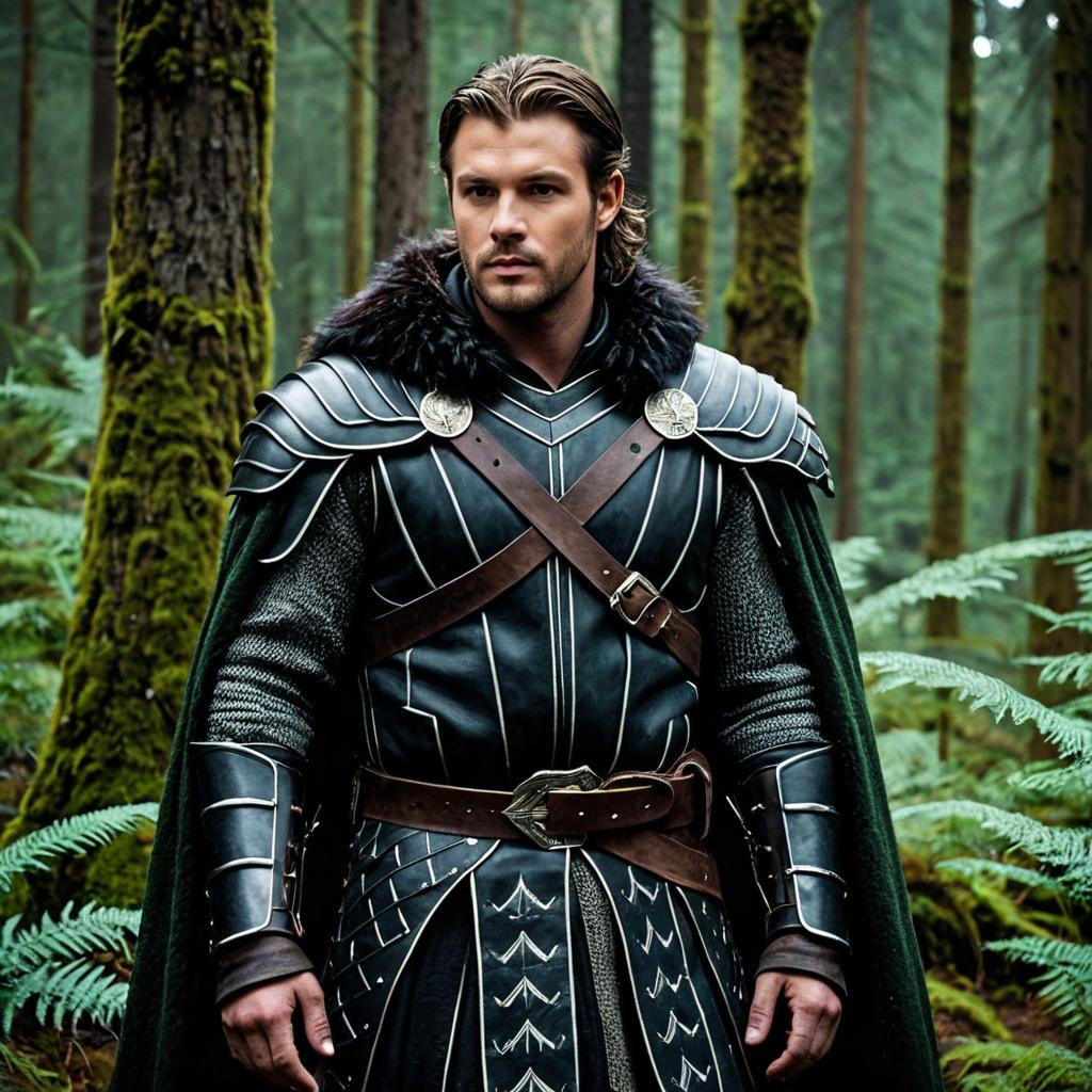 Jon snow nights watch, photo of Chris Hemsworth, standing in forest, wearing medieval fantasy armor, black leather, armor with criss-cross patterns, fur-trimmed cape, dark brown leather belt with buckle, green forest background, tall trees, ferns, serious expression, medium shot, natural light, realistic style, movie still, costume design, rugged, masculine, dark wavy hair, stubble beard, mid-30s