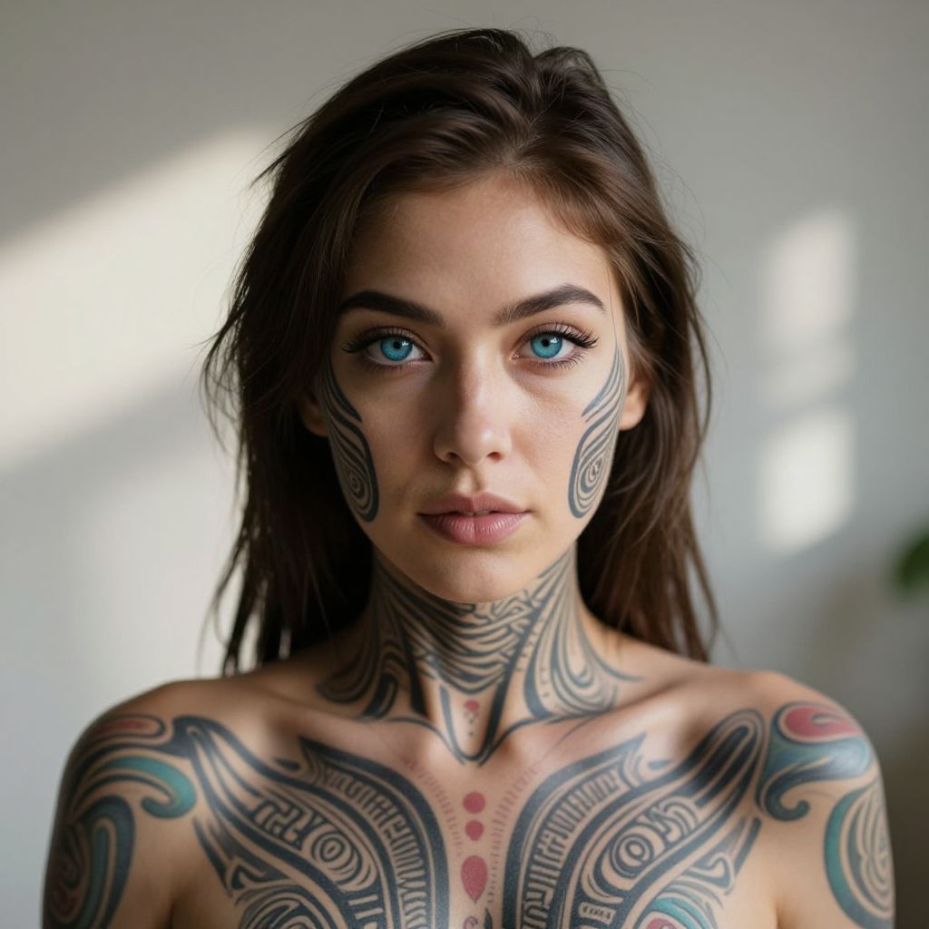 Photograph of a young woman with fair skin and striking blue eyes, standing in a softly lit room. She has long, dark brown hair and is topless, displaying extensive, intricate black tribal tattoos covering her neck, chest, and shoulders. The tattoos feature symmetrical patterns with small red dots in the center of her chest. Her expression is neutral, gazing directly at the camera. The background is blurred, with white walls and soft sunlight casting gentle shadows. The image has a realistic, high-detail style, emphasizing her tattoos and natural beauty.