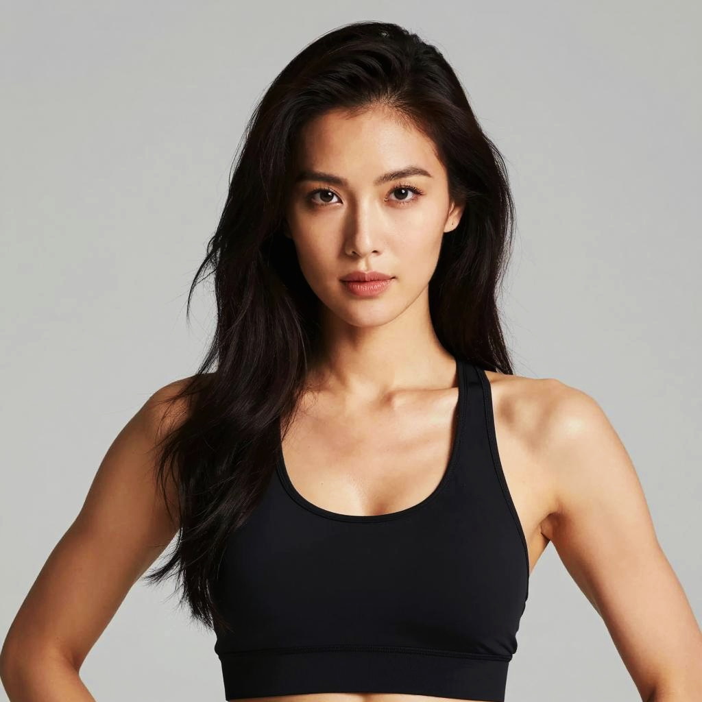 This striking image features a confident woman showcasing her athletic physique, captured on a sports field. Wearing a Nike sports bra, her focused expression embodies the empowerment and determination often associated with modern athleticism.