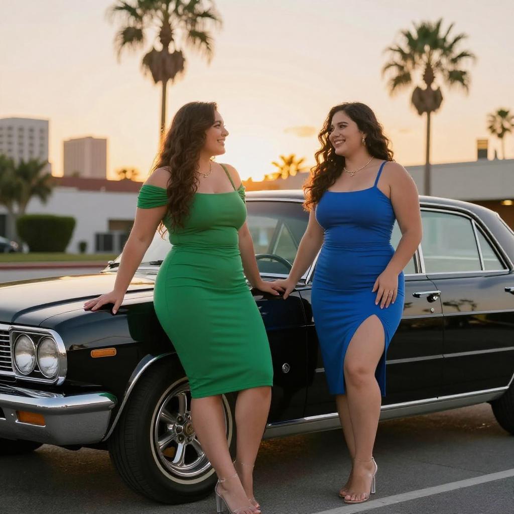 Two curvy women with large breasts, one in a mint green dress and the other in lavender, pose seductively beside a classic car at sunset. The woman in green has a tattoo on her left arm, both wear high heels. Palm trees and a colorful sky form the background.
