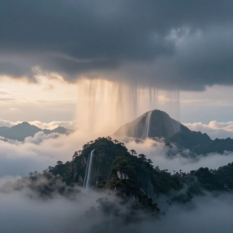 Photograph of a dramatic mountain landscape. A dark, rain-soaked mountain with a prominent peak stands amidst dense, rolling clouds. Sunlight breaks through the thick clouds, casting a bright, ethereal glow onto the mountain. Waterfalls cascade down the mountain's sides, partially visible through the mist. The sky above is filled with heavy, dark clouds, contrasting with the soft, illuminated clouds below. The image captures the serene yet powerful interplay between light and shadow in a misty, tropical environment.