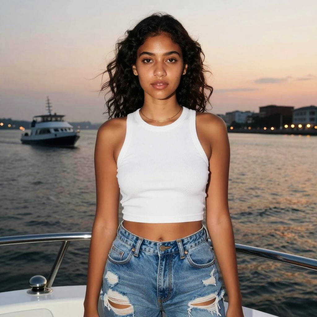 Photograph of a young woman with medium brown skin, long black braided hair, and brown eyes, standing in a bustling urban street. She wears a black sleeveless crop top, blue jeans, a gold wristwatch, and black headphones. She holds a red and blue Nintendo Switch, focused on the screen. The background is slightly blurred, showing pedestrians and storefronts. The woman has a subtle smile, and her skin glistens slightly, suggesting a light sheen of sweat. The overall style is modern and casual, with a vibrant and dynamic urban setting.