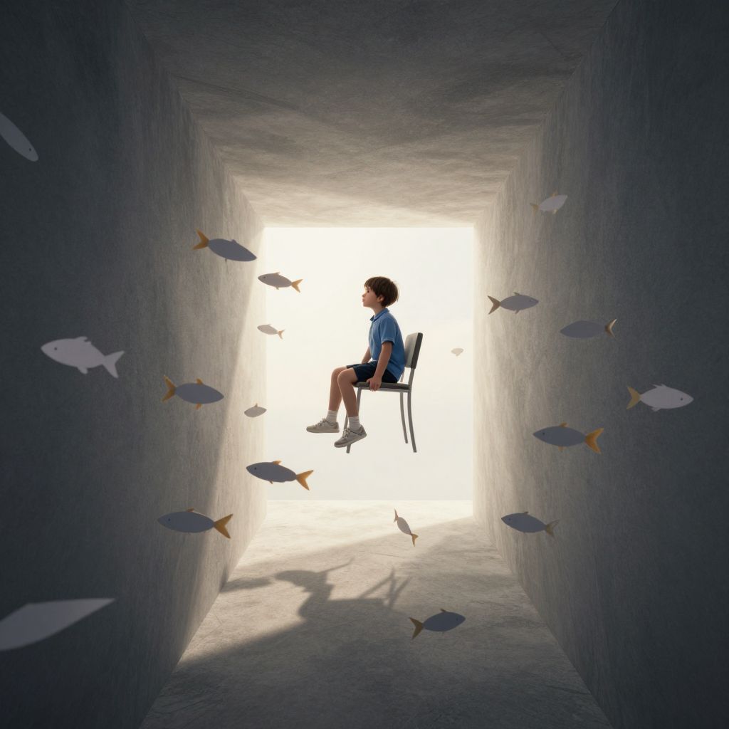 A child rides a chair that flies through inverted gravity alleys, pursued by a school of paper-fish that dissolve when touched by sunlight.