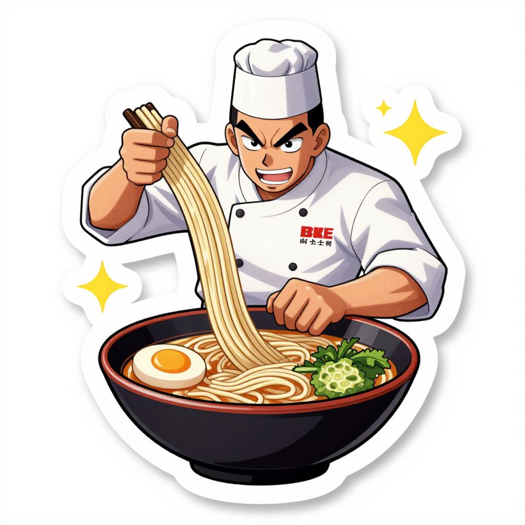 Cartoon-style drawing of a determined male chef in a white uniform, holding noodles over a bowl of ramen with egg, green onion, and garnish