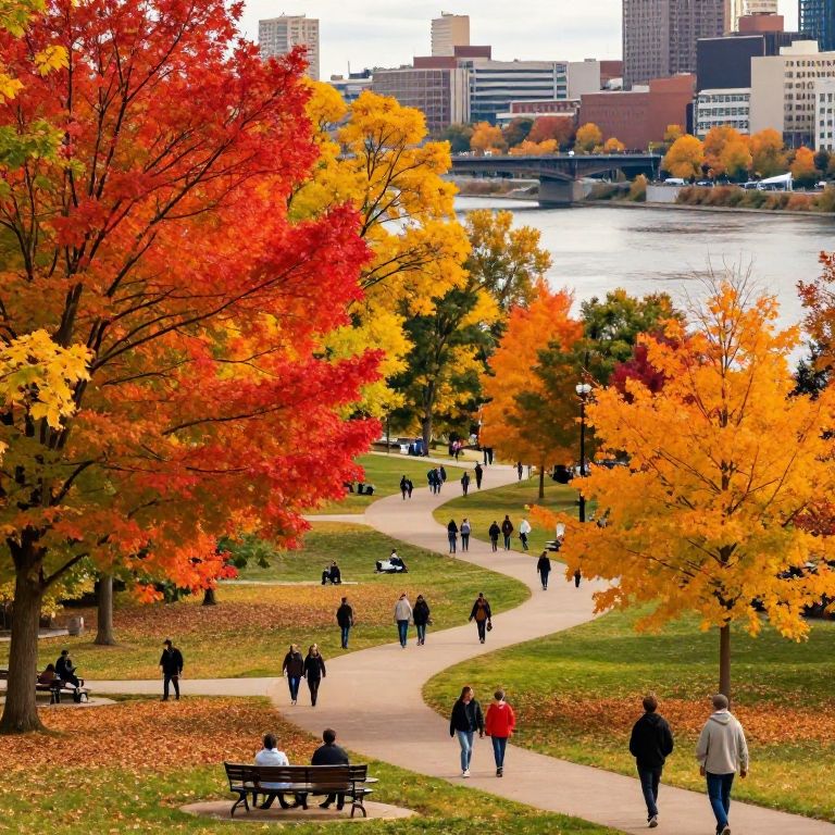 Minneapolis park in autumn, colorful fall foliage with bright reds, oranges, and yellows, winding paths along the Mississippi River, families enjoying outdoor activities, warm natural lighting, impressionistic style blending nature and urban life.
