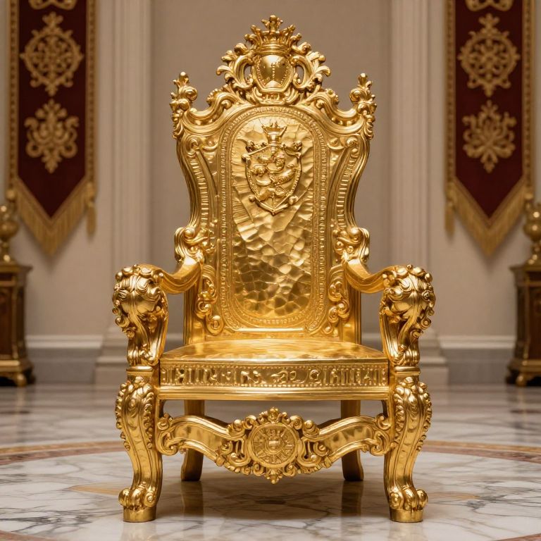 Golden throne art illustrating a magnificent throne made from hammered gold plates, with baroque scrollwork and heraldic symbols, set against a backdrop of a grand throne room with marble floors, richly embroidered banners, and soft reflective lighting.