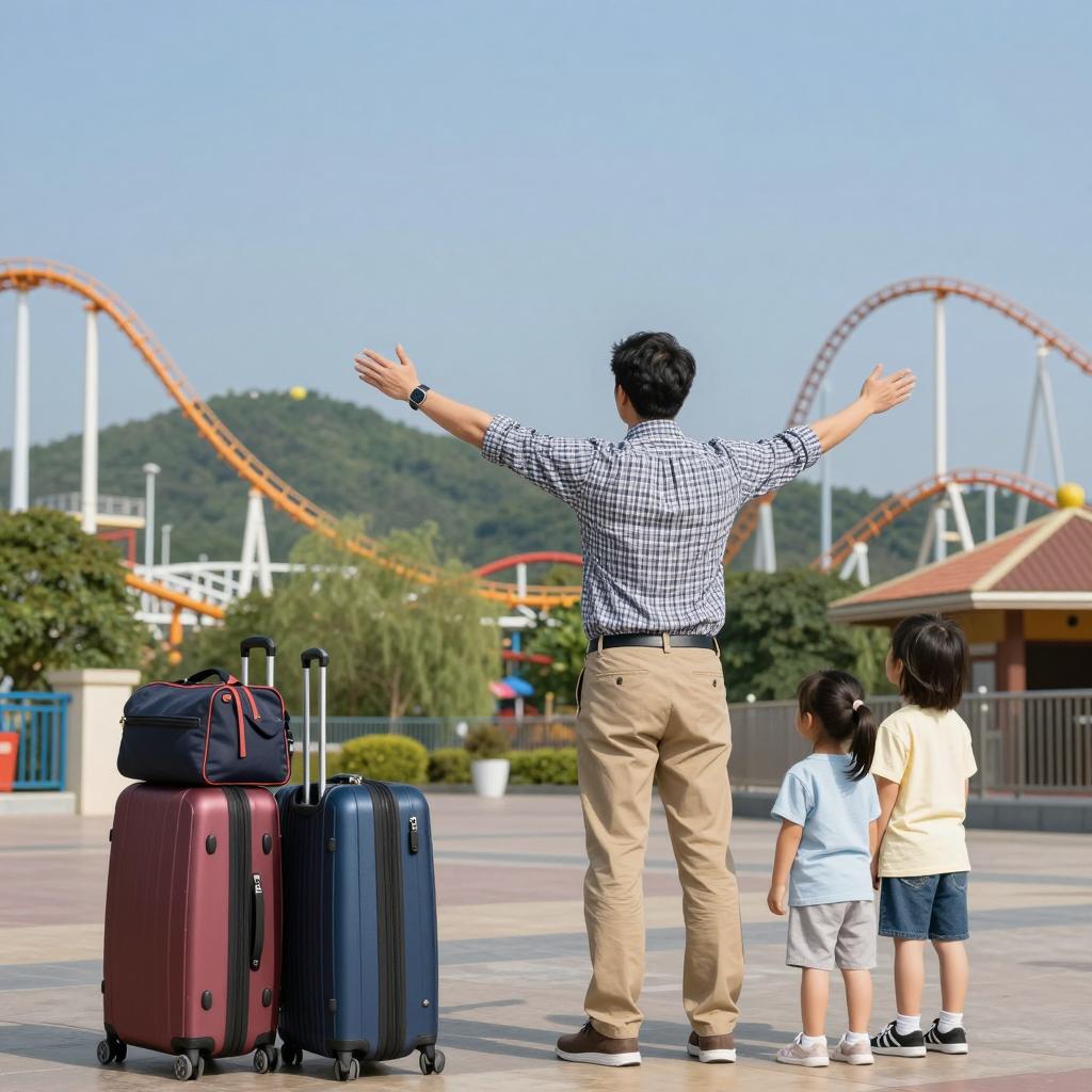 Photograph of three people biking on a street. Foreground: boy in yellow jacket, blue pants, blue bike, intense expression. Center: man in blue jacket, reaching out, red frisbee in hand. Background: person in white shirt, black pants, black bike, left. Right: person in gray jacket, blue pants, blue bike, blurred motion. Background: green trees, suburban houses, mountain. Bright daylight, clear sky.