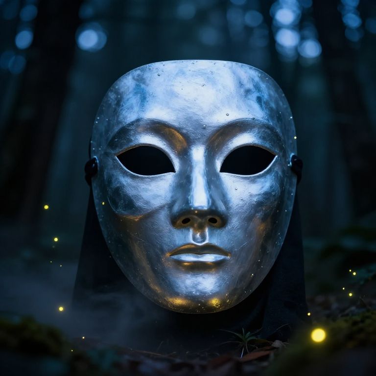 A gleaming mask worn by a mysterious figure in a dark fantasy forest at twilight, shimmering with silver and blue hues, surrounded by glowing fireflies and mist, capturing enchantment and mystique, high detail, fantasy concept art.