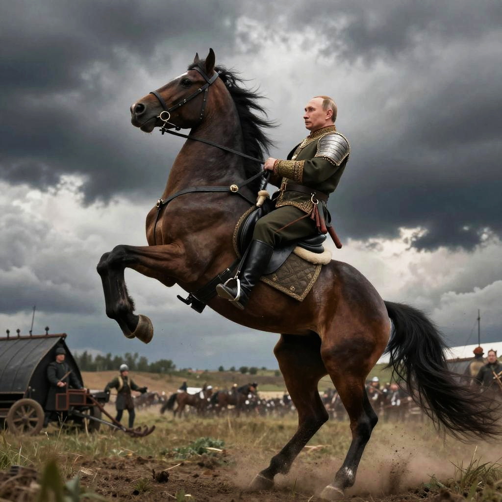 Putin horse riding on a vast, open steppe under a dramatic cloudy sky, dressed in rugged outdoor attire, horse in mid-stride, wild grasses flowing, strong and determined expression, vibrant colors, realistic style, sense of adventure and freedom