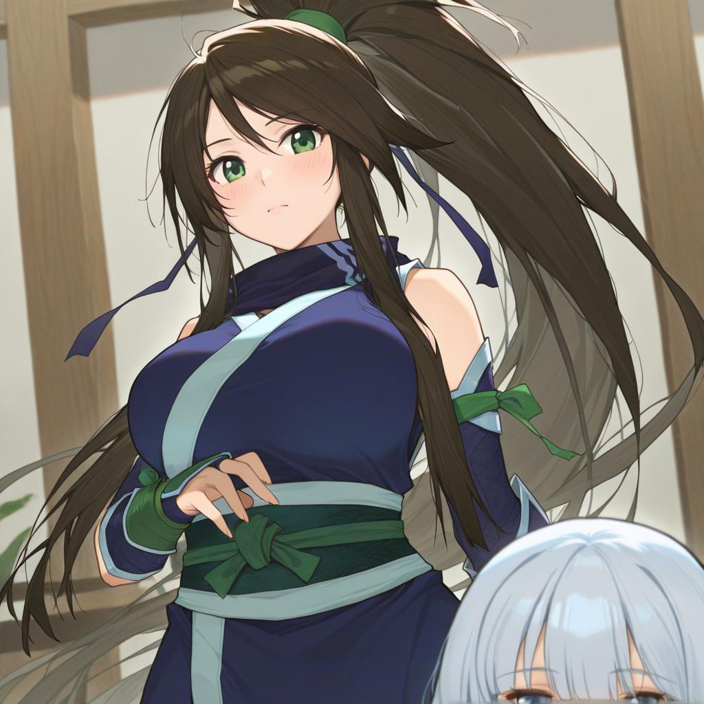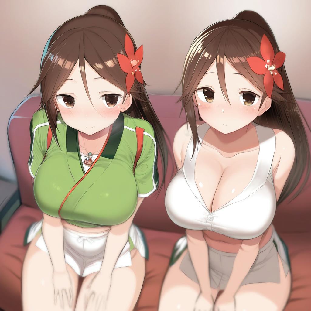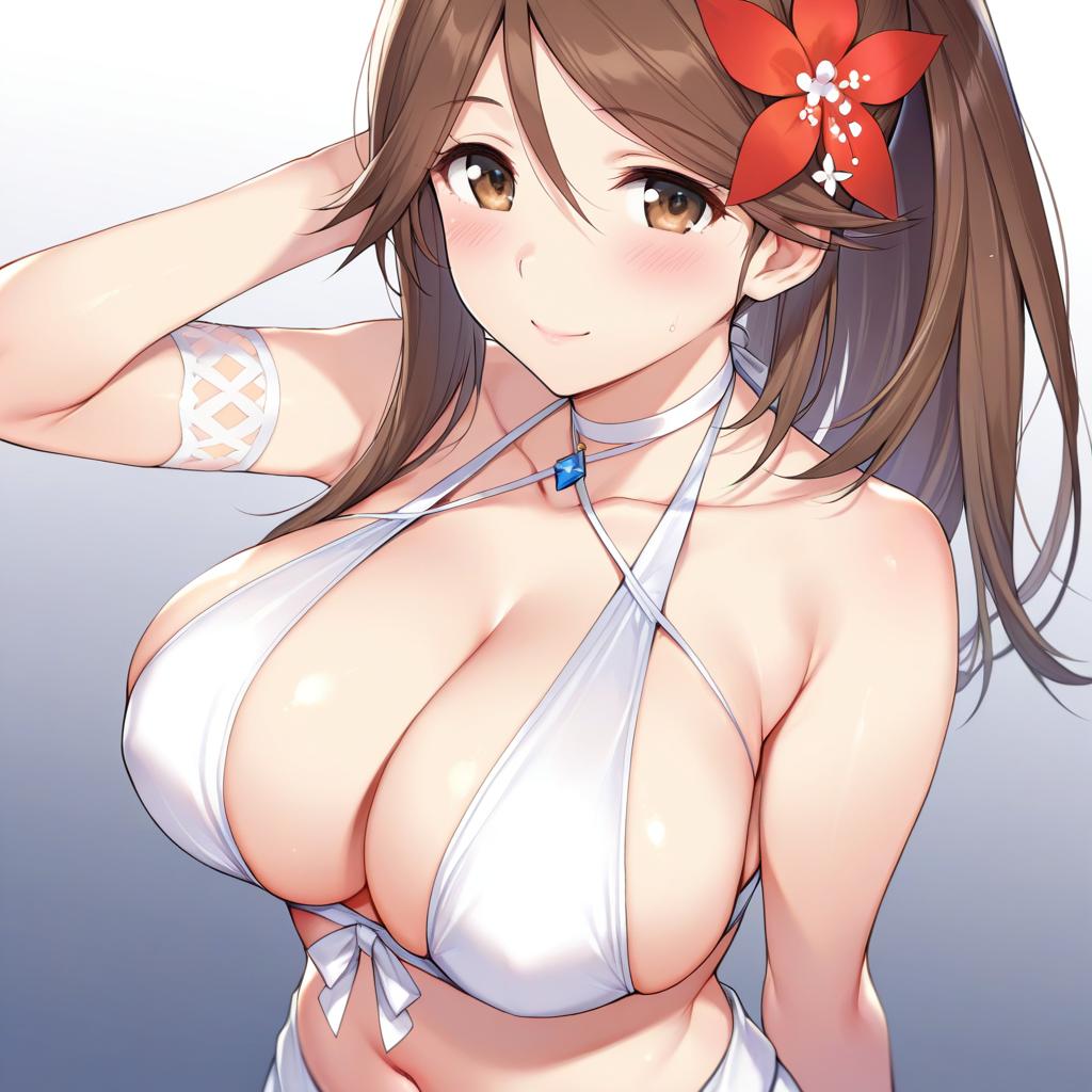 Amagi (kancolle), kantai collection, 1girl, brown eyes, hair between eyes, mole under eye, brown hair, long hair, ponytail, hair flower, large breasts, cleavage, navel, by artist lotosu, leet