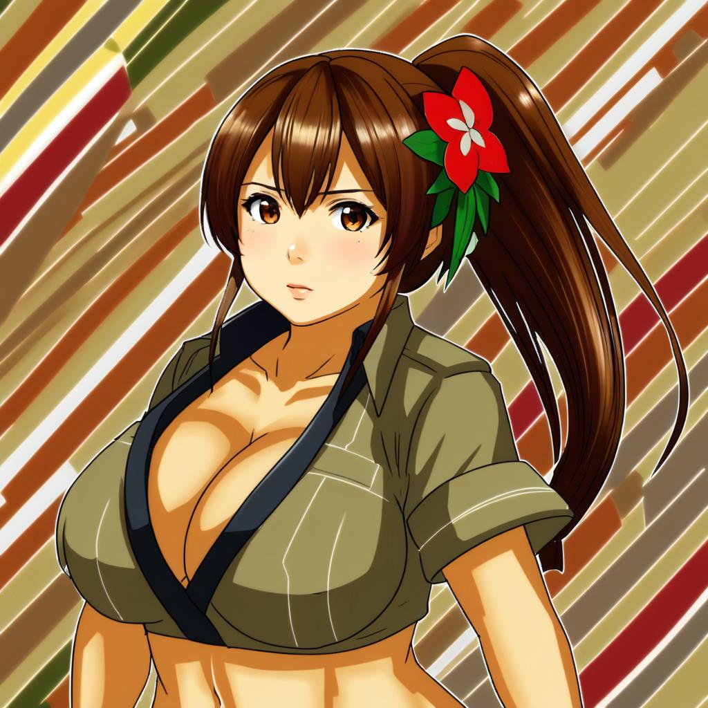 Digital illustration of an anime girl with long brown hair tied in a ponytail, adorned with a large red flower hair accessory. She has brown eyes, a mole under one eye, and is wearing a revealing green outfit with cutout sleeves and red decorative bows. The character shows a confident expression and is lying on a light-colored surface.