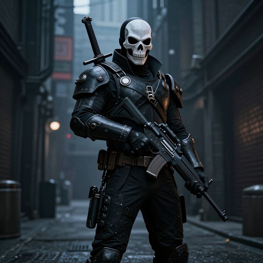 A digital artwork depicts a menacing, futuristic soldier in an alleyway. He wears black, armored gear with metallic textures, a white skull mask with hollow eyes, and carries a rifle in his right hand. A sword is slung over his left shoulder. The background features dark, brick walls and dim streetlights, creating a moody, urban atmosphere. The soldier stands confidently in the center, with a slight fog adding to the eerie ambiance. The color palette is dominated by blacks and blues, enhancing the dystopian feel.