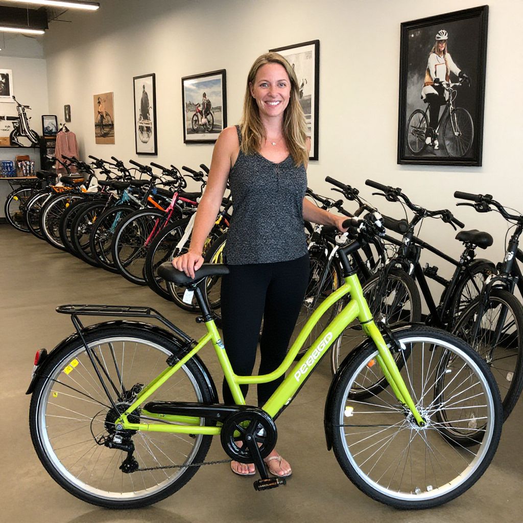 Photograph of a smiling woman with light brown hair standing in a brightly lit bike shop. She wears a dark gray, sleeveless, speckled top and black pants, holding a neon yellow folding bicycle with black rims and a black seat. Behind her, multiple bicycles are lined up against a white wall, adorned with black-and-white framed photographs of cyclists. The floor is polished concrete, and the shop has fluorescent lighting. The woman stands slightly to the right of center, with the bicycle positioned in front of her.