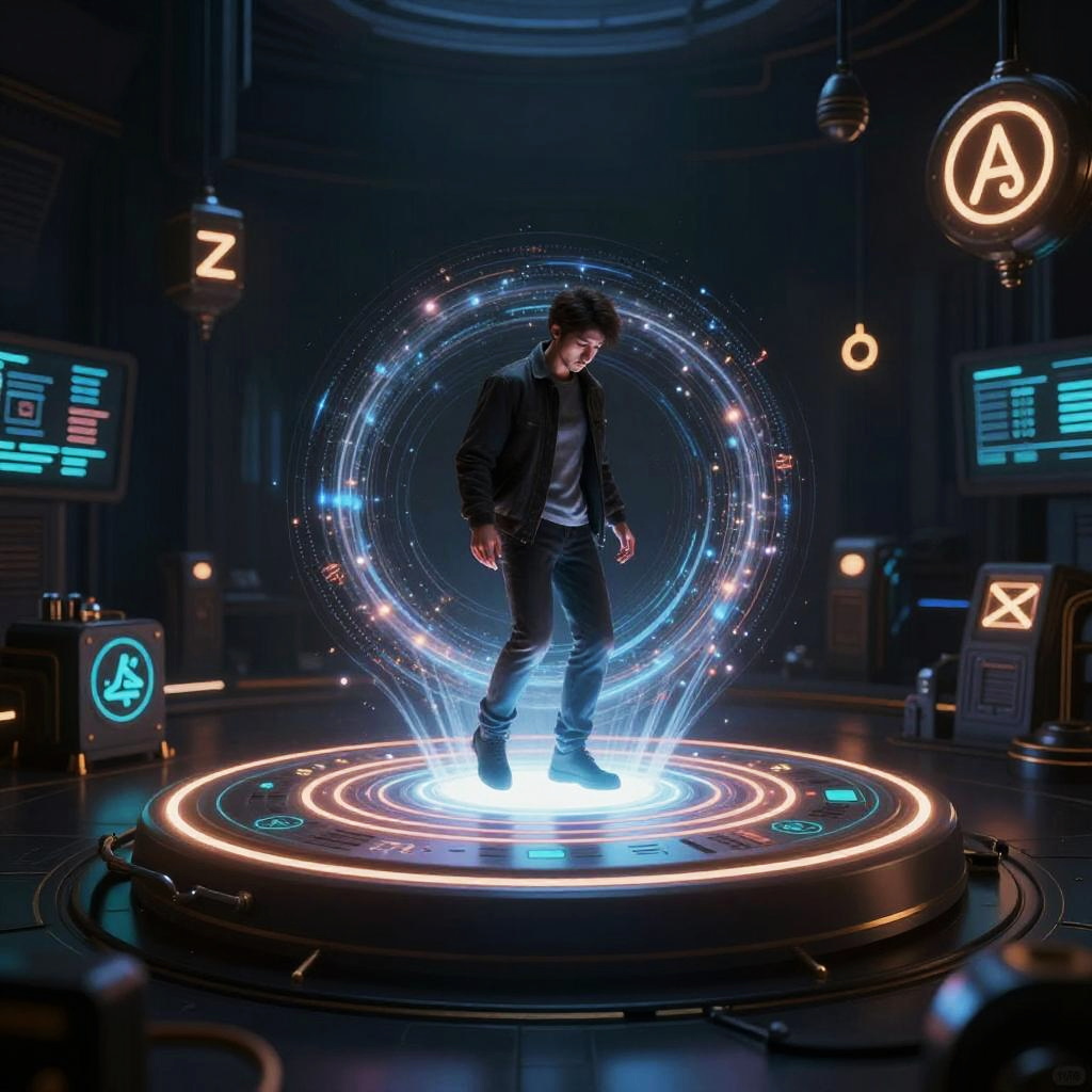 Teleportation pad mid-activation with a person stepping into a swirling portal of light, set in a dark room filled with glowing symbols and arcane technology, mysterious and otherworldly vibe