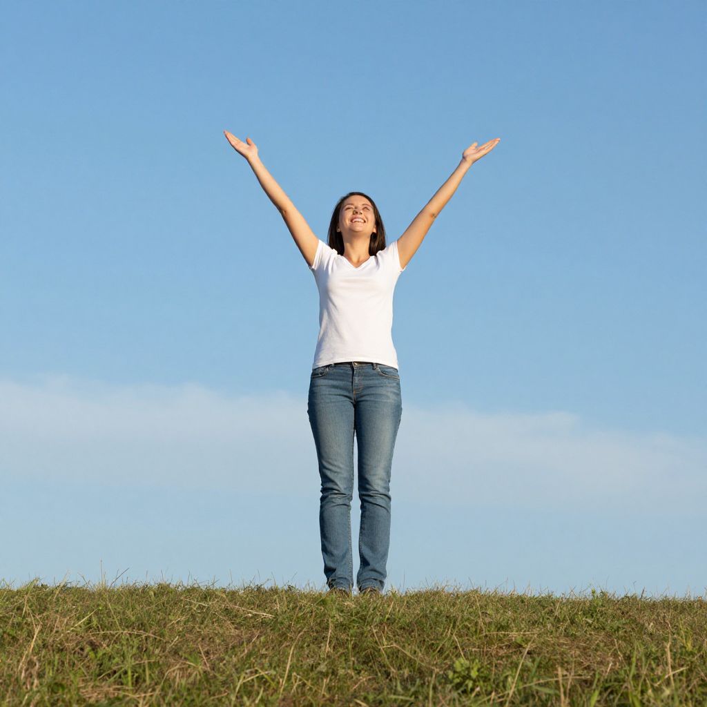 Photograph of a young woman with light skin and shoulder-length, wavy brown hair. She is smiling warmly, showcasing her white teeth. She wears a light blue, sleeveless tank top that fits snugly. The background features a clear blue sky and a grassy field that stretches into the distance, suggesting an outdoor setting. The lighting is natural, highlighting her face and hair. The overall composition is simple and focuses on the subject, with a shallow depth of field that blurs the background slightly. Her expression is friendly and approachable.
